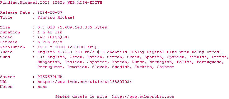 Voir le nfo de la release Finding.Michael.2023.1080p.WEB.H264-EDITH