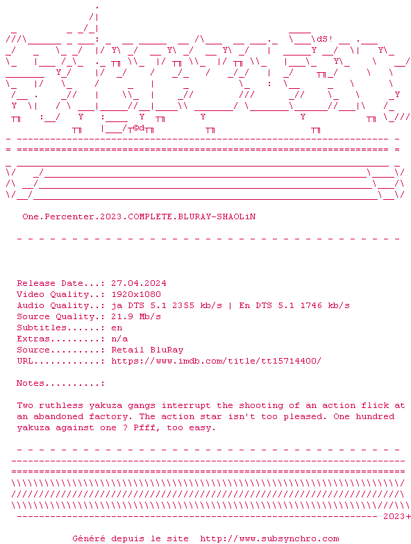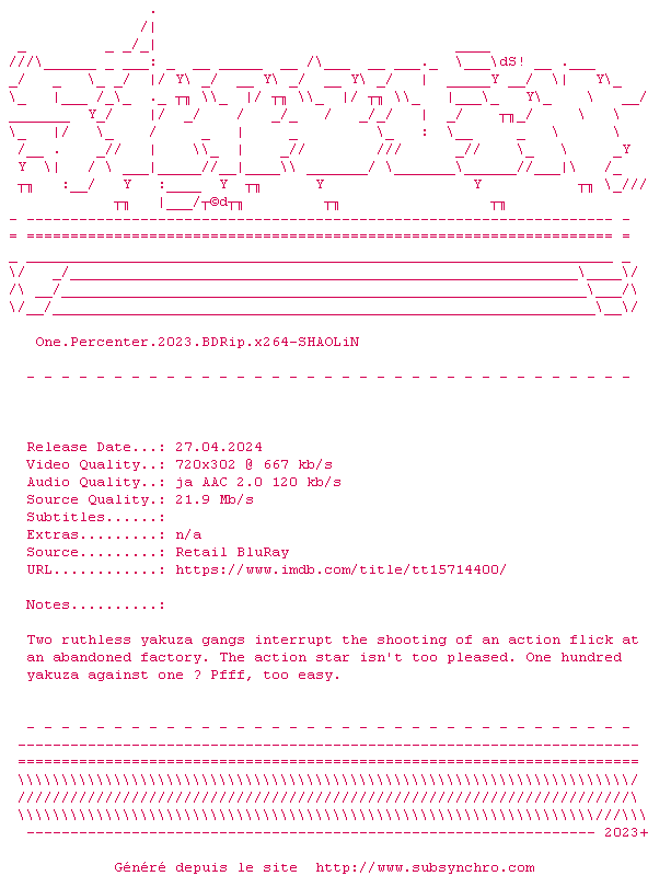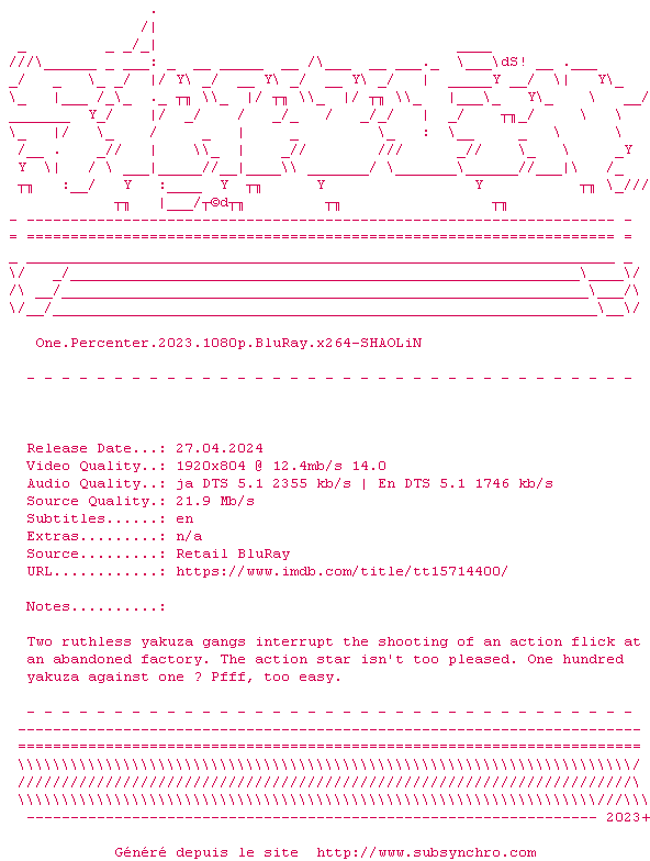 Voir le nfo de la release One.Percenter.2023.1080p.BluRay.x264-SHAOLiN