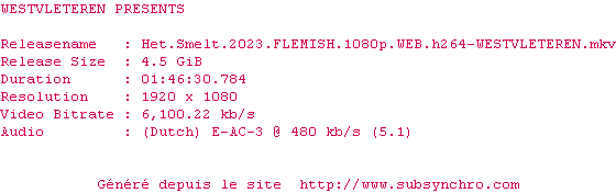 | Voir le nfo de la release Het.Smelt.2023.FLEMISH.1080p.WEB.H264-WESTVLETEREN | WESTVLETEREN | Het.Smelt.2023.FLEMISH.1080p.WEB.H264-WESTVLETEREN OpenSubtitles | 0 fichier |
