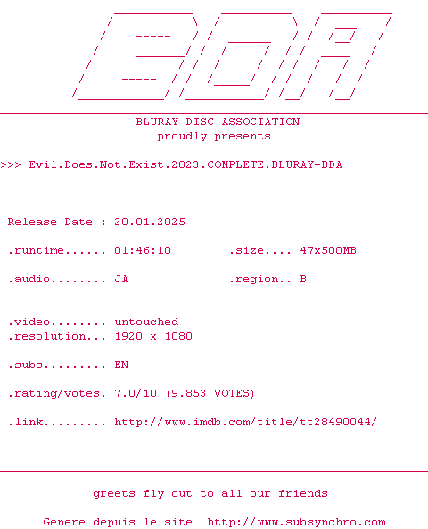 Voir le nfo de la release Evil.Does.Not.Exist.2023.COMPLETE.BLURAY-BDA