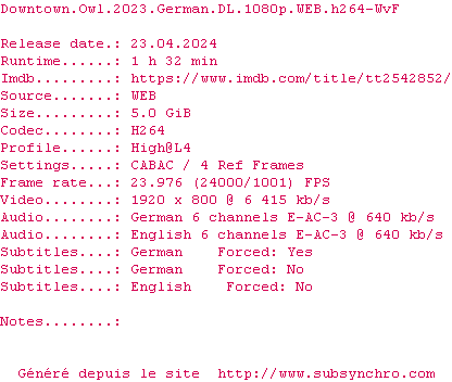 Voir le nfo de la release Downtown.Owl.2023.German.DL.1080p.WEB.H264-WvF