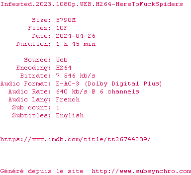 Voir le nfo de la release Infested.2023.1080p.WEB.H264-HereToFuckSpiders