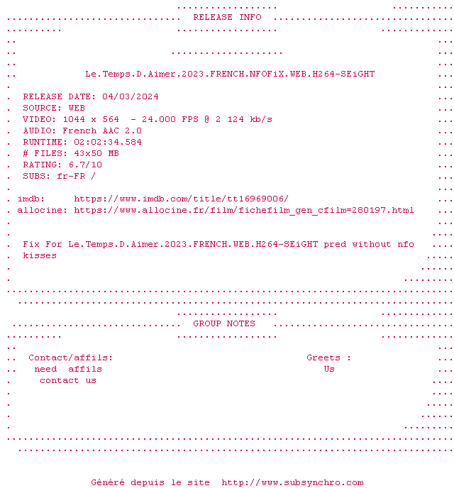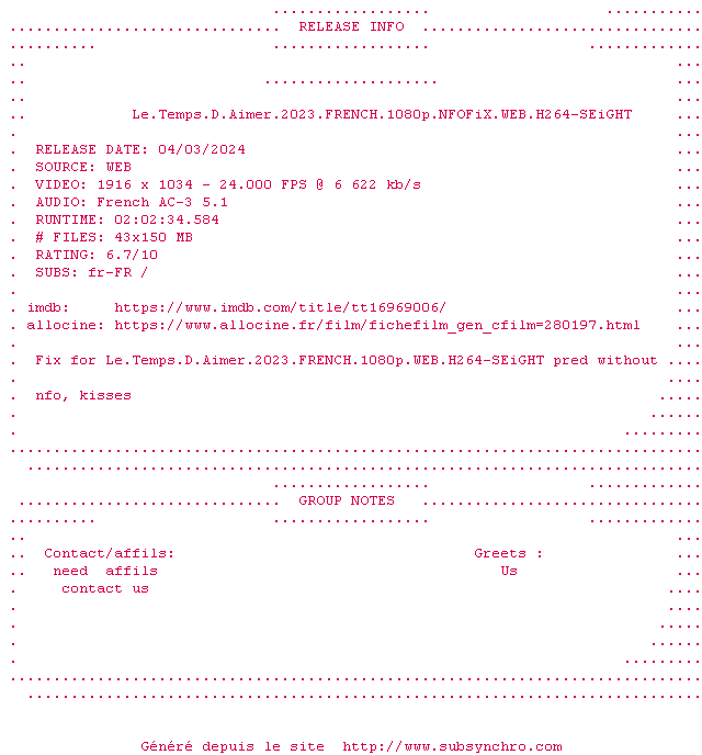 Voir le nfo de la release Le.Temps.D.Aimer.2023.FRENCH.720p.WEB.H264-SEiGHT