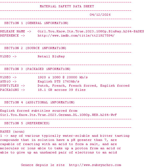Y avez-vous pense ? Nous proposons déjà 1630 sous-titres pour le film Girl You Know It's True. Avez-vous essaye de voir si ces sous-titres etaient compatibles avec cette release ? On vous laisse le soin de tester cela pour nous et de contribuer au site en postant le sous-titre en cas de compatiblite constatee !