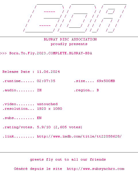 Voir le nfo de la release Born.To.Fly.2023.COMPLETE.BLURAY-BDA