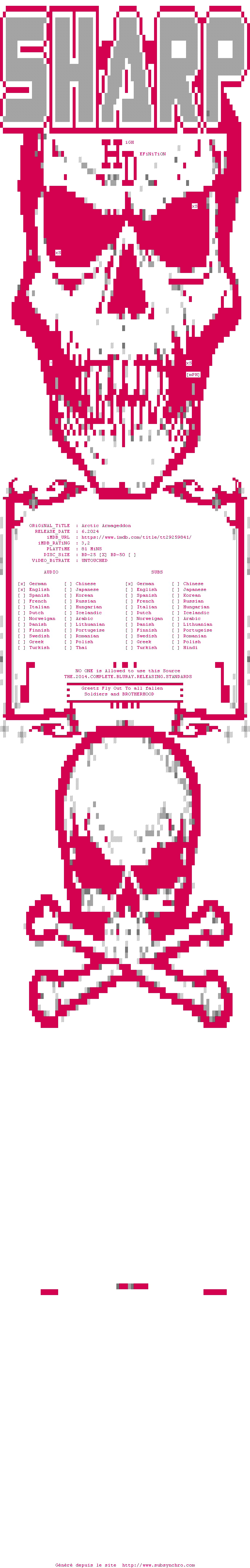 | Voir le nfo de la release Arctic.Armageddon.2023.MULTi.COMPLETE.BLURAY-SharpHD | SharpHD | Arctic.Armageddon.2023.MULTi.COMPLETE.BLURAY-SharpHD OpenSubtitles | 0 fichier |