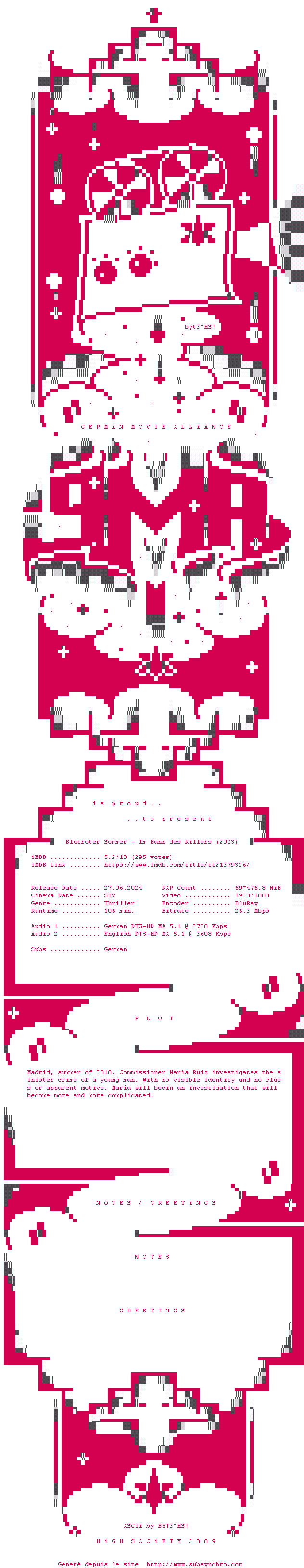 | Voir le nfo de la release Blutroter.Sommer.Im.Bann.Des.Killers.2023.MULTi.COMPLETE.BLURAY-GMA | GMA | Blutroter.Sommer.Im.Bann.Des.Killers.2023.MULTi.COMPLETE.BLURAY-GMA OpenSubtitles | 0 fichier |