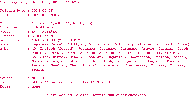 Voir le nfo de la release The.Imaginary.2023.1080p.WEB.H264-DOLORES