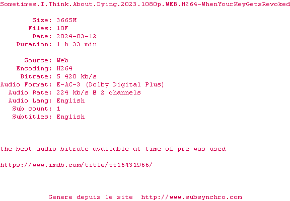 Voir le nfo de la release Sometimes.I.Think.About.Dying.2023.1080p.WEB.H264-WhenYourKeyGetsRevoked