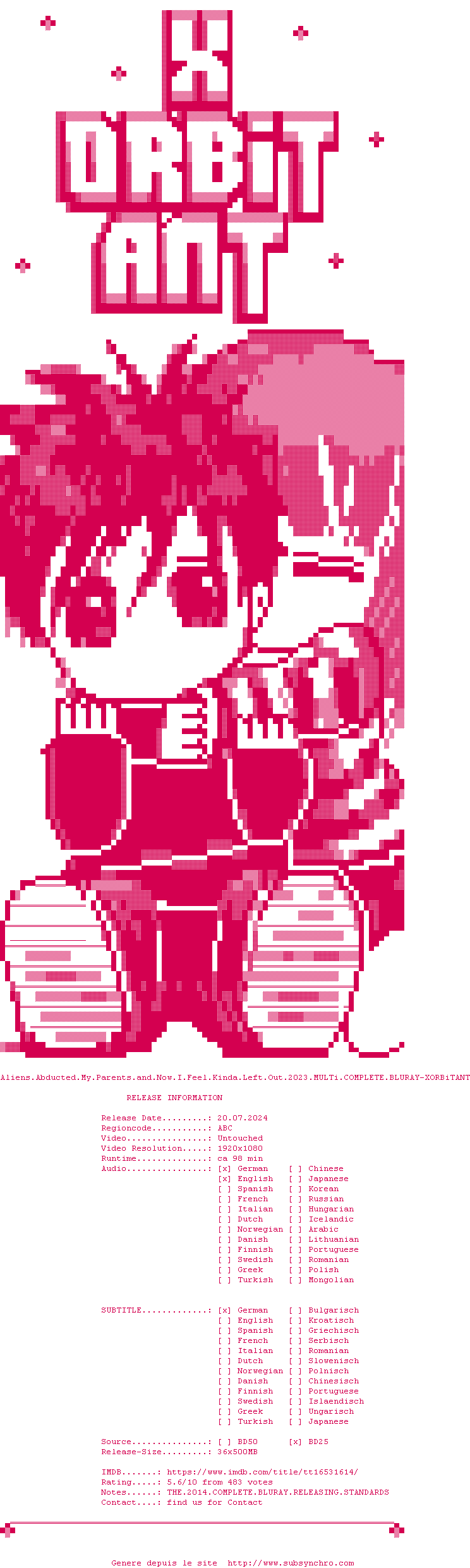 Voir le nfo de la release Aliens.Abducted.My.Parents.And.Now.I.Feel.Kinda.Left.Out.2023.MULTi.COMPLETE.BLURAY-XORBiTANT