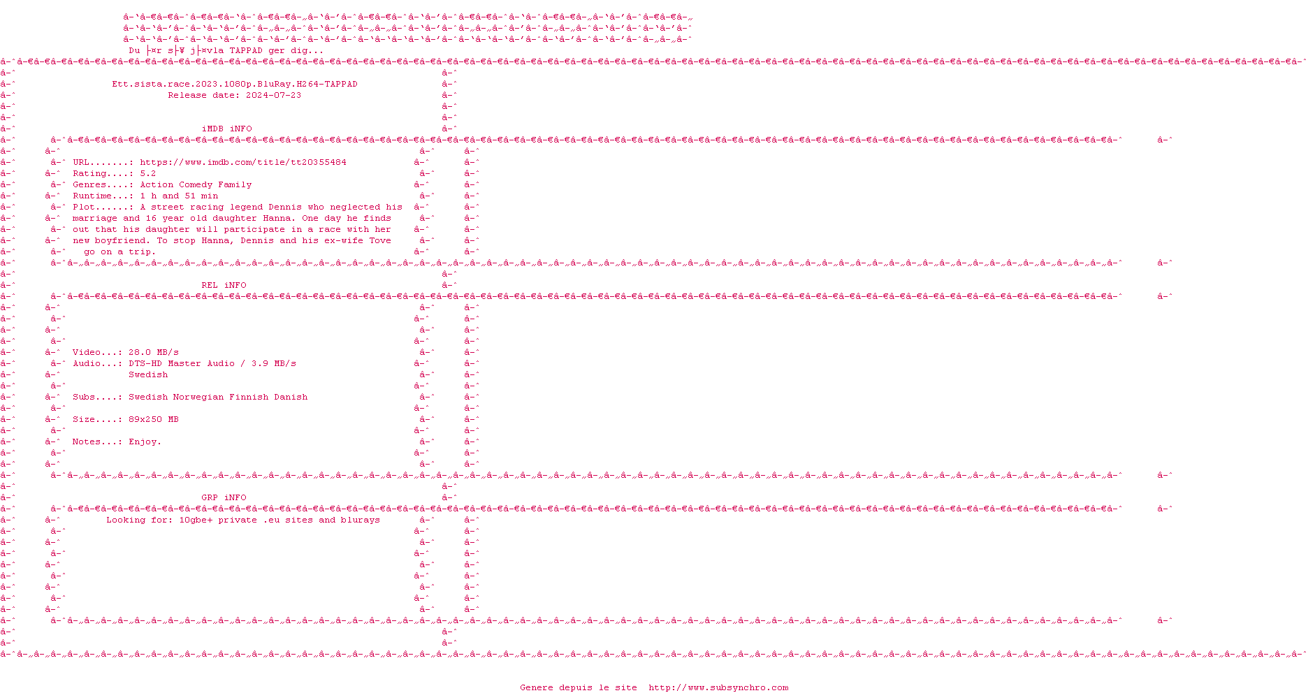 Voir le nfo de la release Ett.Sista.Race.2023.1080p.BluRay.H264-TAPPAD