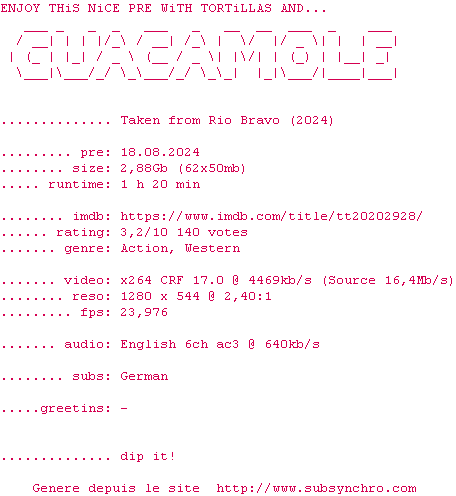 Voir le nfo de la release Taken.From.Rio.Bravo.2024.720p.BluRay.x264-GUACAMOLE