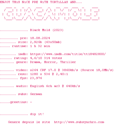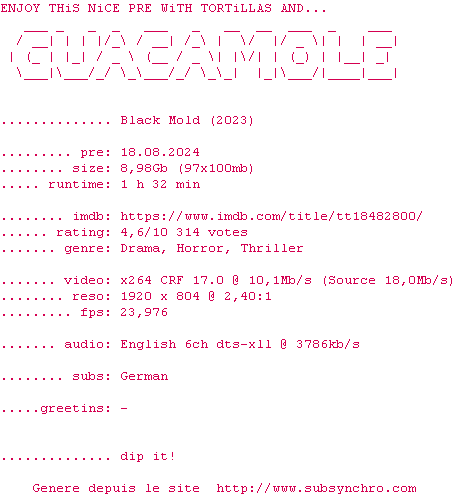Voir le nfo de la release Black.Mold.2023.BDRiP.x264-GUACAMOLE