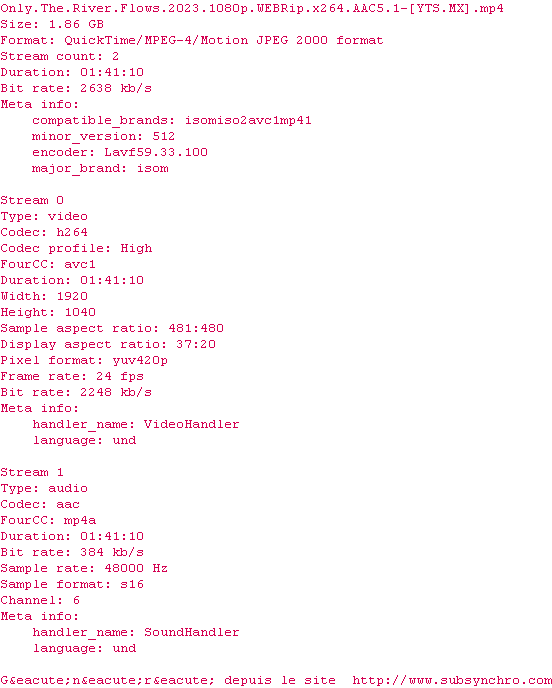 Voir le nfo de la release Only.The.River.Flows.2023.720p.WEBRip.x264.AAC-YTS