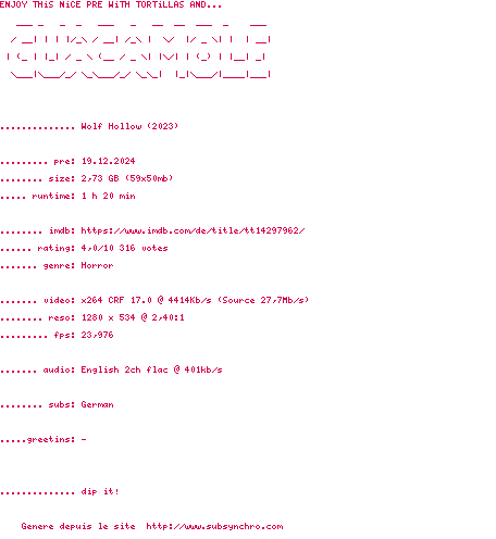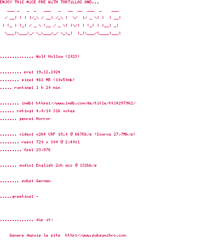 Voir le nfo de la release Wolf.Hollow.2023.720p.BluRay.x264-GUACAMOLE