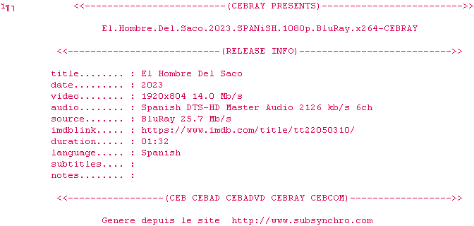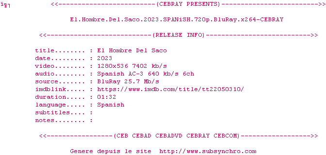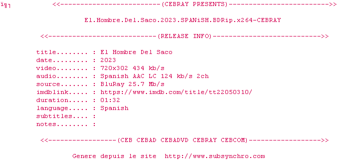 Voir le nfo de la release El.Hombre.Del.Saco.2023.SPANiSH.BDRip.x264-CEBRAY