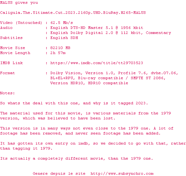 Voir le nfo de la release Caligula.The.Ultimate.Cut.2023.2160p.UHD.BluRay.H265-MALUS