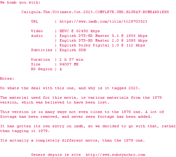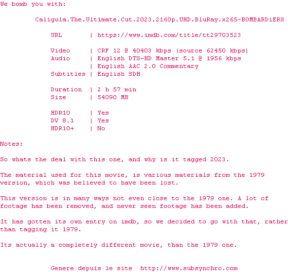 Voir le nfo de la release Caligula.The.Ultimate.Cut.2023.2160p.UHD.BluRay.x265-B0MBARDiERS