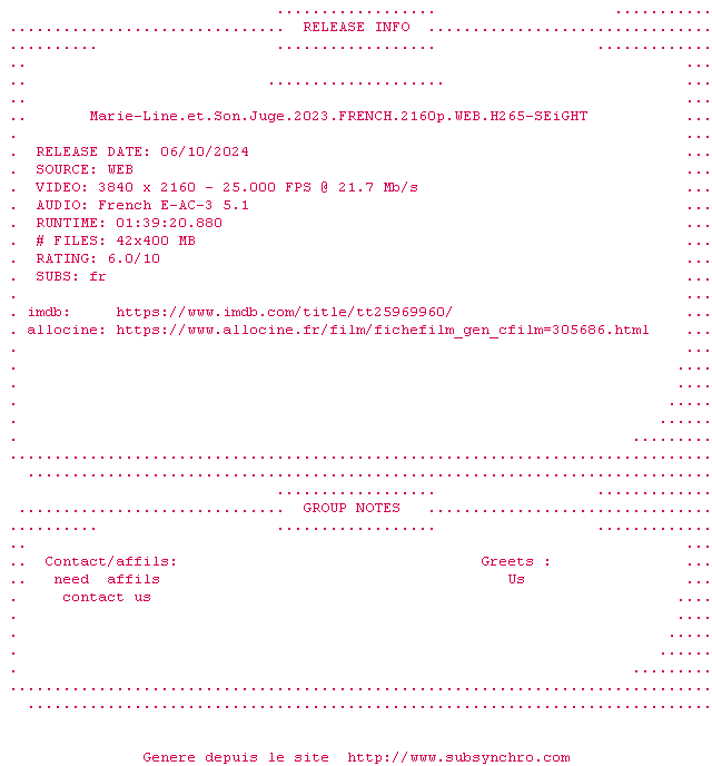 Y avez-vous pense ? Nous proposons déjà 1050 sous-titres pour le film Marie-Line et son juge. Avez-vous essaye de voir si ces sous-titres etaient compatibles avec cette release ? On vous laisse le soin de tester cela pour nous et de contribuer au site en postant le sous-titre en cas de compatiblite constatee !