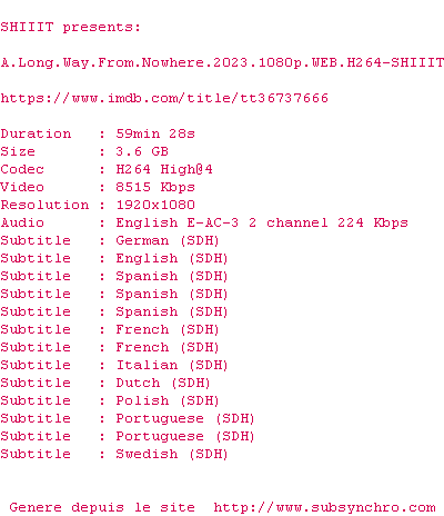 Y avez-vous pense ? Nous proposons déjà 1172 sous-titres pour le film A Long Way from Nowhere. Avez-vous essaye de voir si ces sous-titres etaient compatibles avec cette release ? On vous laisse le soin de tester cela pour nous et de contribuer au site en postant le sous-titre en cas de compatiblite constatee !