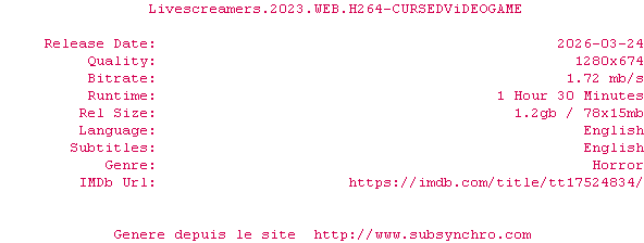 Y avez-vous pense ? Nous proposons déjà 1294 sous-titres pour le film Livescreamers. Avez-vous essaye de voir si ces sous-titres etaient compatibles avec cette release ? On vous laisse le soin de tester cela pour nous et de contribuer au site en postant le sous-titre en cas de compatiblite constatee !