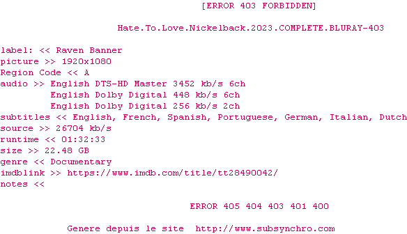 Y avez-vous pense ? Nous proposons déjà 1631 sous-titres pour le film Hate to Love: Nickelback. Avez-vous essaye de voir si ces sous-titres etaient compatibles avec cette release ? On vous laisse le soin de tester cela pour nous et de contribuer au site en postant le sous-titre en cas de compatiblite constatee !