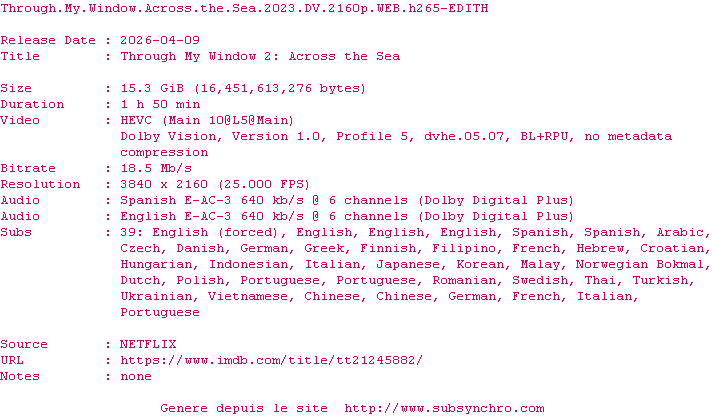 La release Through.My.Window.Across.The.Sea.2023.DV.2160p.WEB.H265-EDITH est en 4K
