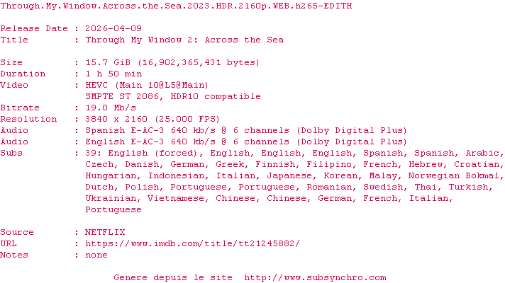 Y avez-vous pense ? Nous proposons déjà 1631 sous-titres pour le film À travers ma fenêtre : L'amour pour horizon / Through My Window: Across the Sea. Avez-vous essaye de voir si ces sous-titres etaient compatibles avec cette release ? On vous laisse le soin de tester cela pour nous et de contribuer au site en postant le sous-titre en cas de compatiblite constatee !