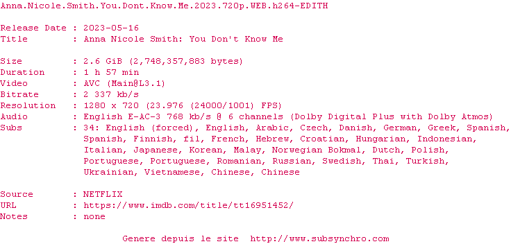 Y avez-vous pense ? Nous proposons déjà 1 sous-titre pour le film Celle que vous croyez connaître : Anna Nicole Smith. Avez-vous essaye de voir si ces sous-titres etaient compatibles avec cette release ? On vous laisse le soin de tester cela pour nous et de contribuer au site en postant le sous-titre en cas de compatiblite constatee !