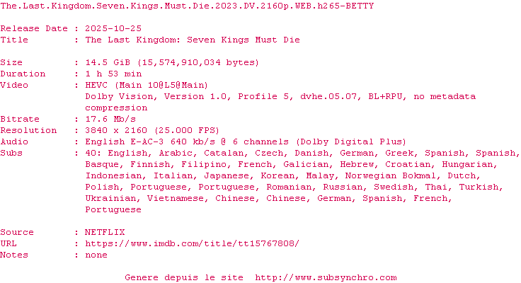 Y avez-vous pense ? Nous proposons déjà 5 sous-titres pour le film The Last Kingdom : Sept rois doivent mourir. Avez-vous essaye de voir si ces sous-titres etaient compatibles avec cette release ? On vous laisse le soin de tester cela pour nous et de contribuer au site en postant le sous-titre en cas de compatiblite constatee !