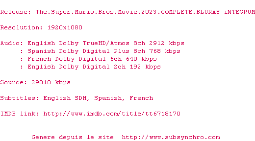 Y avez-vous pense ? Nous proposons déjà 7 sous-titres pour le film Super Mario Bros, le film. Avez-vous essaye de voir si ces sous-titres etaient compatibles avec cette release ? On vous laisse le soin de tester cela pour nous et de contribuer au site en postant le sous-titre en cas de compatiblite constatee !