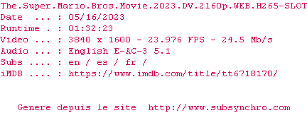 La release The.Super.Mario.Bros.Movie.2023.DV.2160p.WEB.H265-SLOT est en 4K