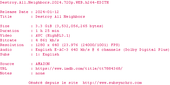 Voir le nfo de la release Destroy.All.Neighbors.2024.720p.WEB.H264-EDITH