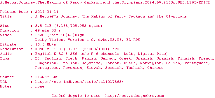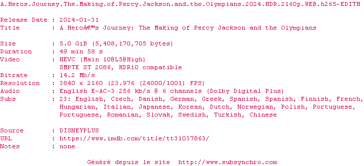 Voir le nfo de la release A.Heros.Journey.The.Making.Of.Percy.Jackson.And.The.Olympians.2024.HDR.2160p.WEB.H265-EDITH