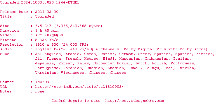 Voir le nfo de la release Upgraded.2024.1080p.WEB.H264-ETHEL