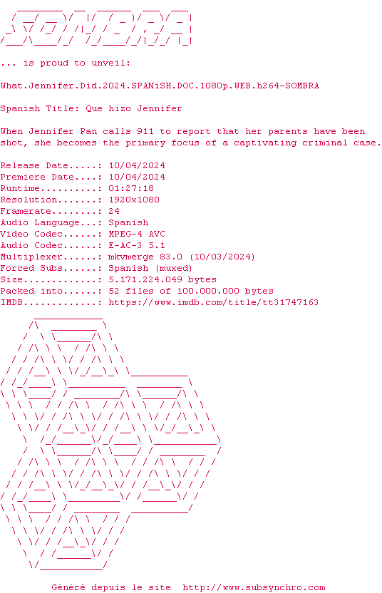 | Voir le nfo de la release What.Jennifer.Did.2024.SPANiSH.DOC.1080p.WEB.H264-SOMBRA | SOMBRA | What.Jennifer.Did.2024.SPANiSH.DOC.1080p.WEB.H264-SOMBRA OpenSubtitles | 0 fichier | ||