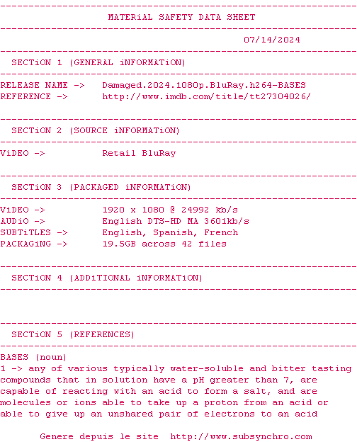 Voir le nfo de la release Damaged.2024.1080p.BluRay.H264-BASES