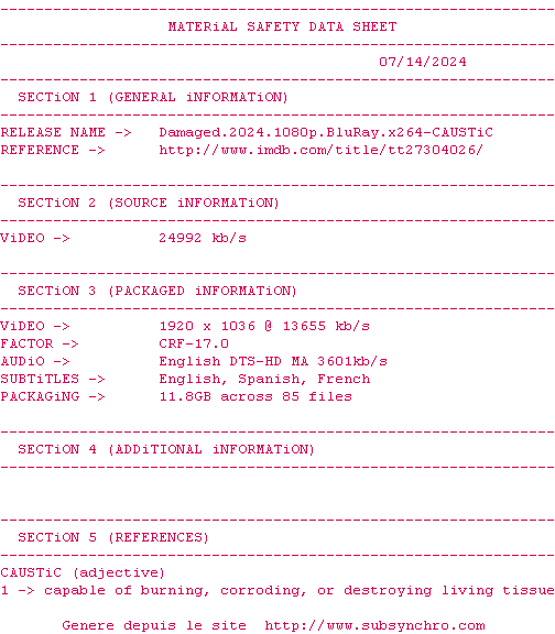 Voir le nfo de la release Damaged.2024.1080p.BluRay.x264-CAUSTiC
