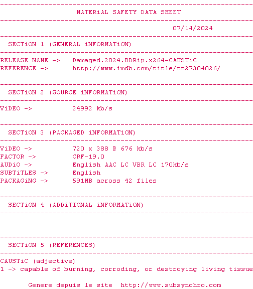 Voir le nfo de la release Damaged.2024.BDRip.x264-CAUSTiC