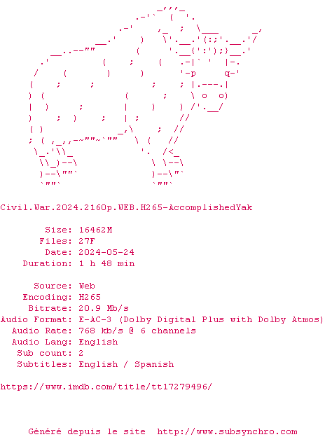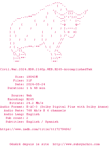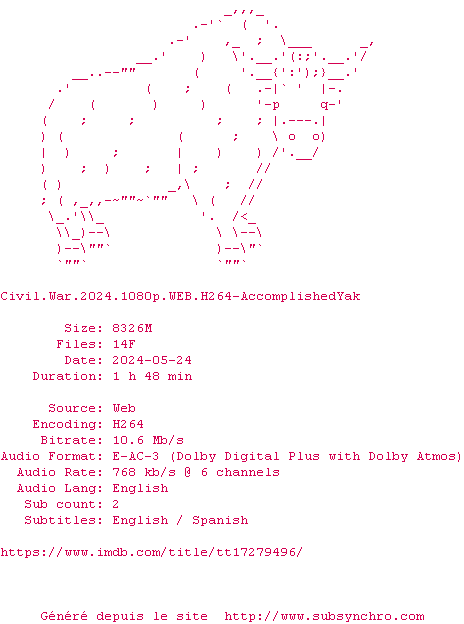 Voir le nfo de la release Civil.War.2024.HDR.2160p.WEB.H265-AccomplishedYak