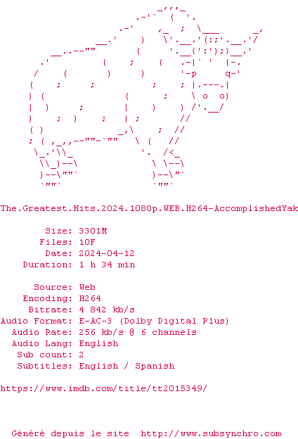 Voir le nfo de la release The.Greatest.Hits.2024.1080p.WEB.H264-AccomplishedYak