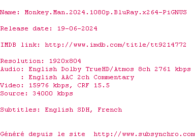 Voir le nfo de la release Monkey.Man.2024.1080p.BluRay.x264-PiGNUS