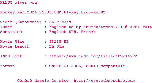 Voir le nfo de la release Monkey.Man.2024.2160p.UHD.BluRay.H265-MALUS