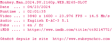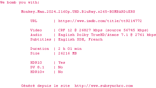 Voir le nfo de la release Monkey.Man.2024.HDR.2160p.WEB.H265-SLOT