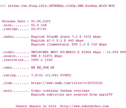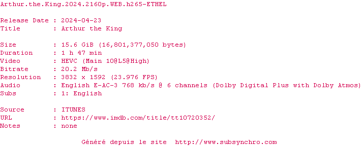 Voir le nfo de la release Arthur.The.King.2024.2160p.WEB.H265-ETHEL