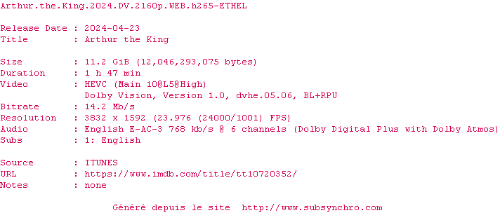 Voir le nfo de la release Arthur.The.King.2024.DV.2160p.WEB.H265-ETHEL