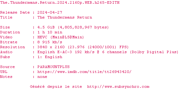 | Voir le nfo de la release The.Thundermans.Return.2024.2160p.WEB.H265-EDITH | EDITH | The.Thundermans.Return.2024.2160p.WEB.H265-EDITH OpenSubtitles La release The.Thundermans.Return.2024.2160p.WEB.H265-EDITH est en 4K | 0 fichier |