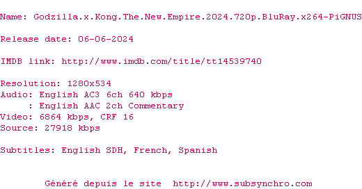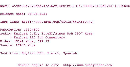 Voir le nfo de la release Godzilla.X.Kong.The.New.Empire.2024.1080p.BluRay.x264-PiGNUS