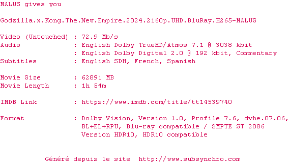 Voir le nfo de la release Godzilla.X.Kong.The.New.Empire.2024.2160p.UHD.BluRay.H265-MALUS