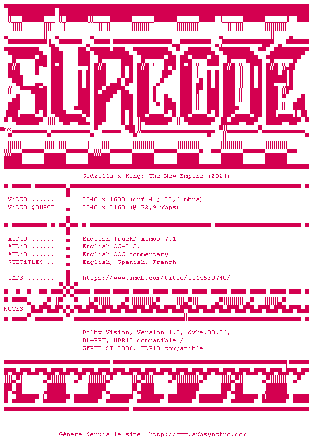 Voir le nfo de la release Godzilla.X.Kong.The.New.Empire.2024.2160p.UHD.BluRay.x265-SURCODE